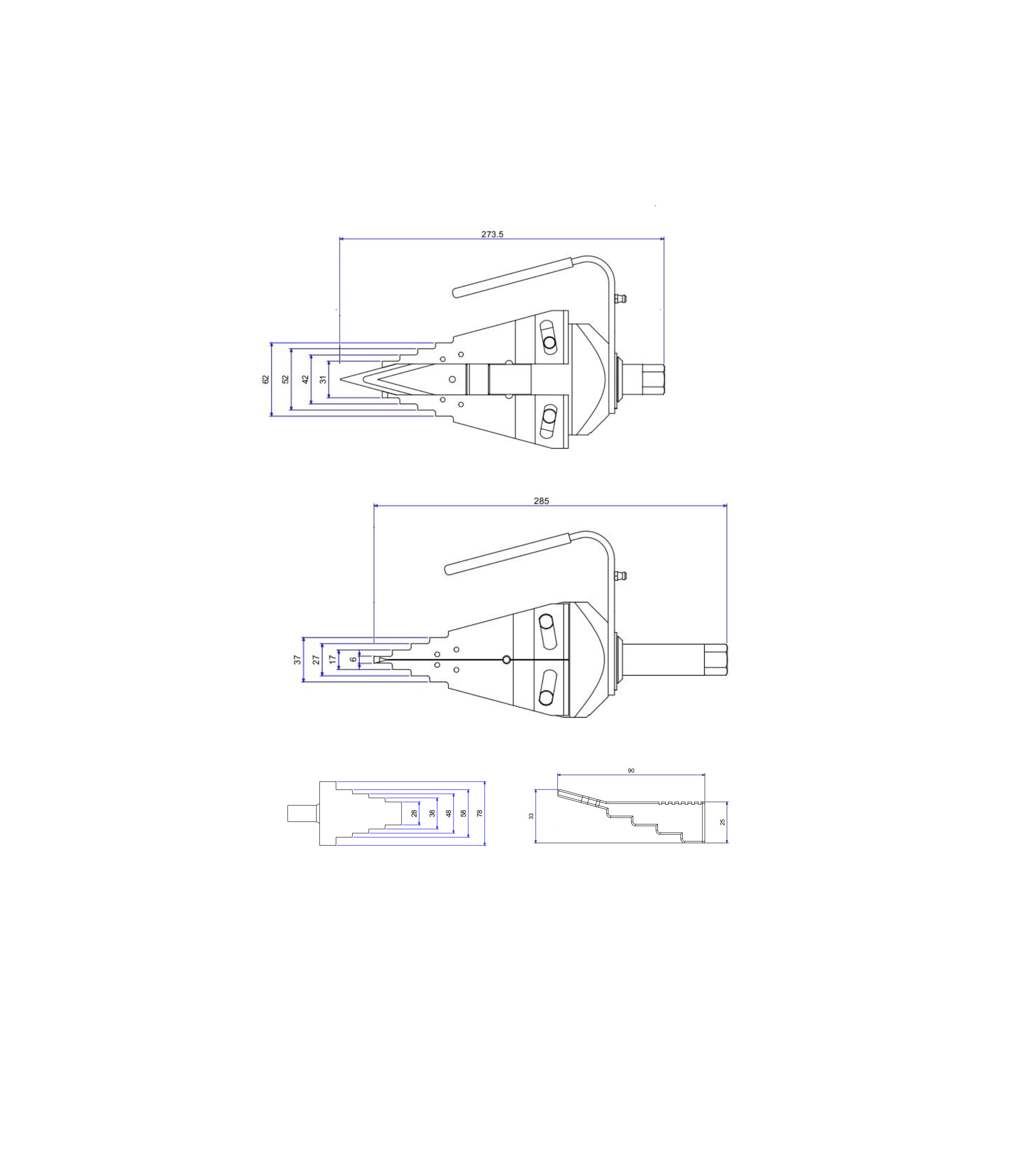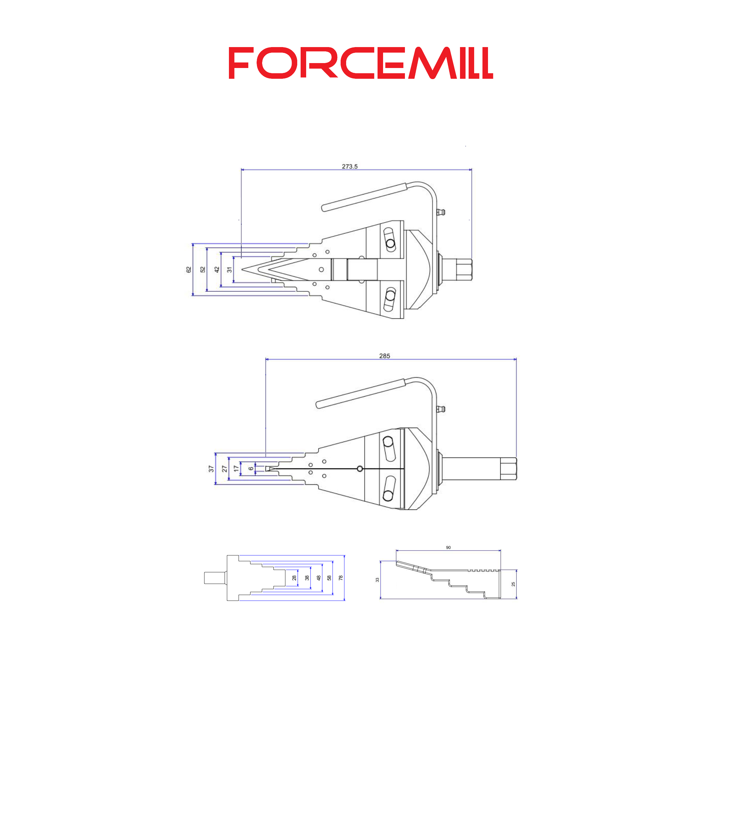 Max. Wedge opening is 25 mm and Max. Spread when using stepped block is 81 mm.